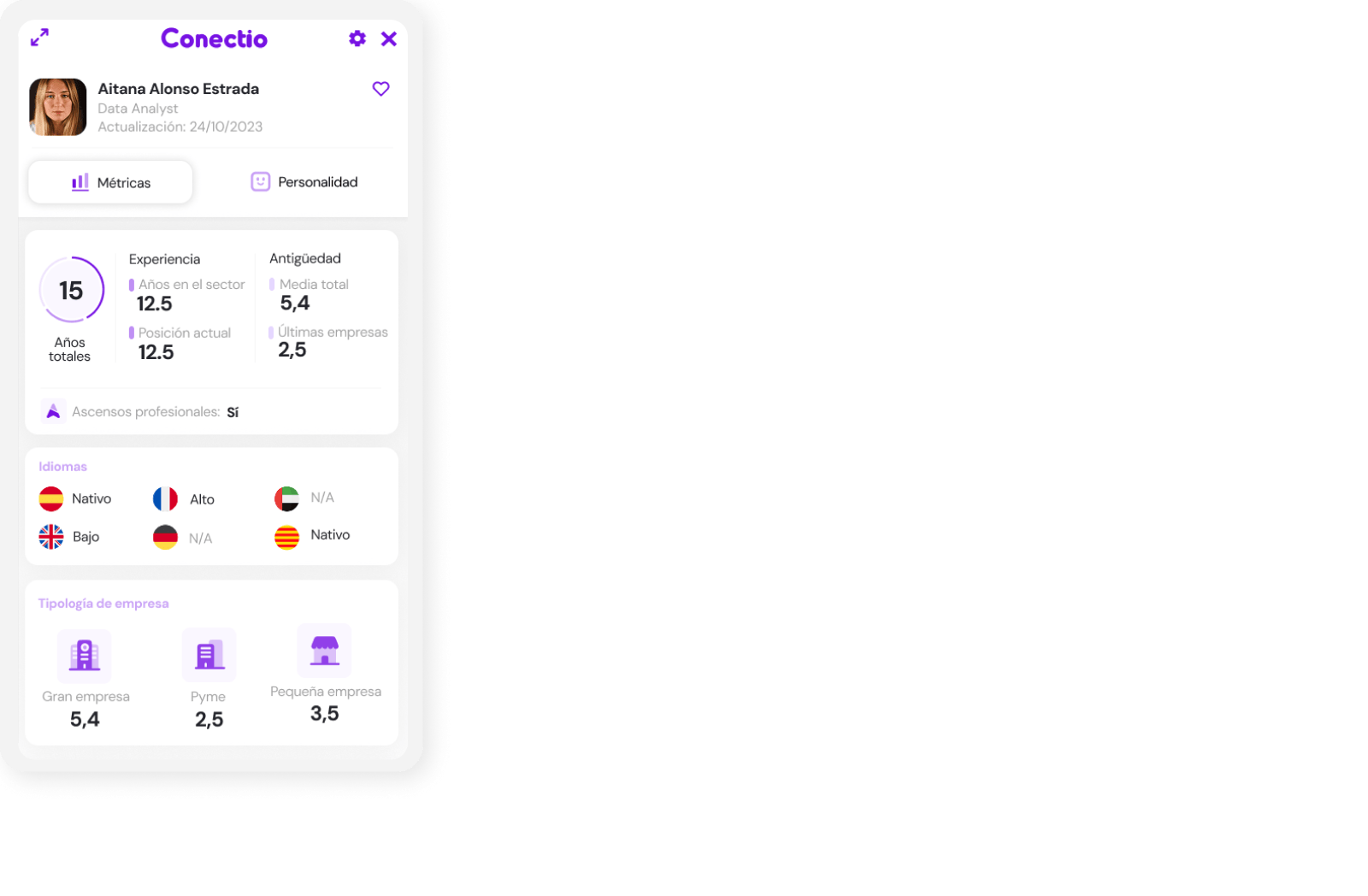 Visualiza rápidamente los puntos clave de su experiencia y entiende su recorrido profesional de un vistazo.